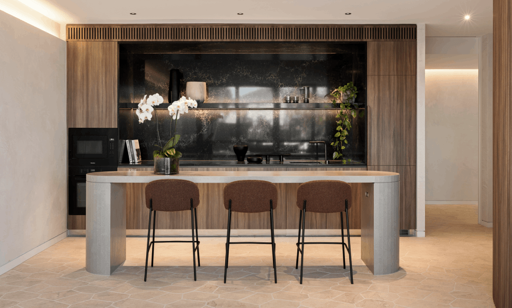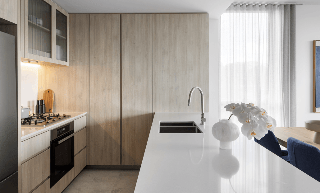 - Reconstituted stone benchtops, brushed platinum tapware, and timber-look joinery complete the kitchen design