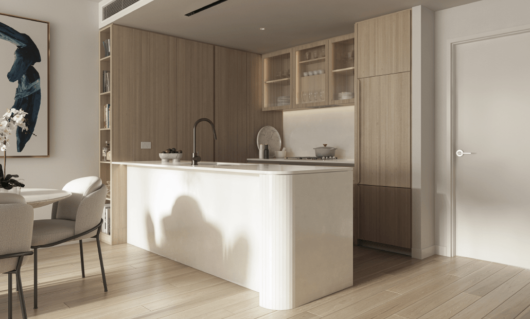 Inspired by the natural splendour of the surrounds, this masterfully designed one-bedroom residence enjoys generous open-plan living flows onto a private balcony, seamlessly bringing the outdoors in. Perfect for entertaining and dining in, the premium kitchen is complete with premium Miele appliances, reconstituted stone benchtops and an island bench complete with an exquisite mitred edge detail.
