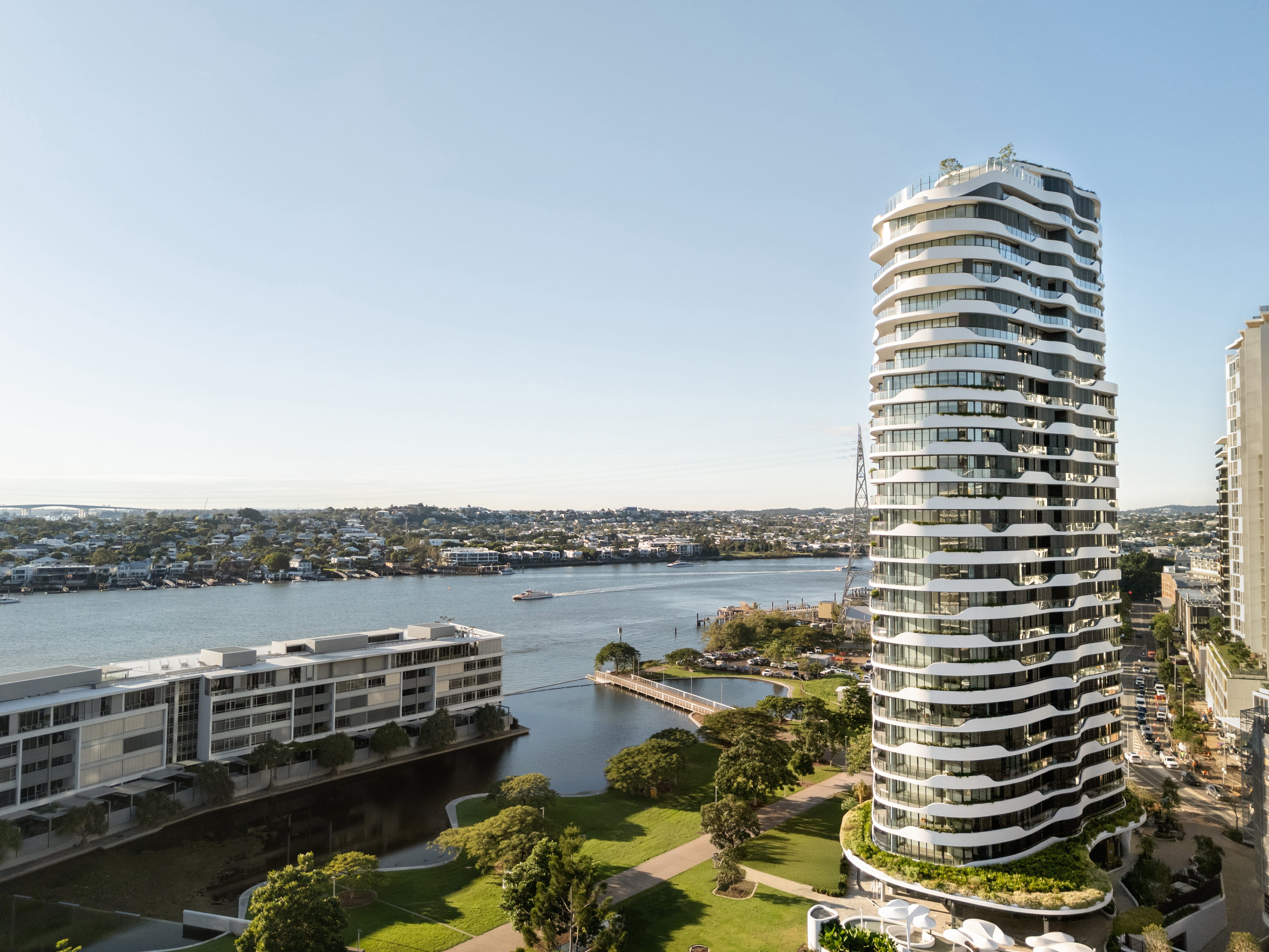 Quay Waterfront Newstead is a living, breathing building with a boldly organic form and an unequivocal focus on wellbeing. Conceived as a park within a park, its façade is enriched by lush vertical planting which complements the rippling lines of its encircling balconies. This biophilic design extends the park across approximately 25 storeys, and 135 luxury apartments, and lends a garden freshness to life within.